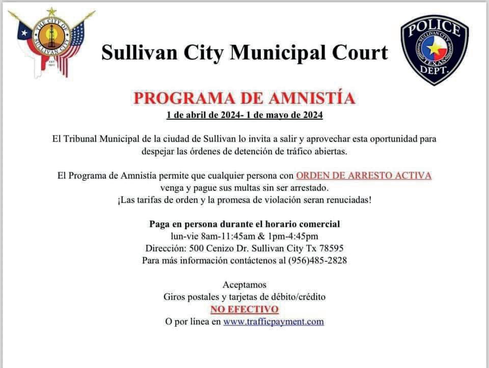 E l Tribunal Municipal de Sullivan City cuenta con un programa de amnistía que comenzó el 1 de abril y durará hasta el 1 de mayo. Si tiene órdenes de arresto o de tráfico activas, lo alentamos a que venga y las resuelva. Para obtener más