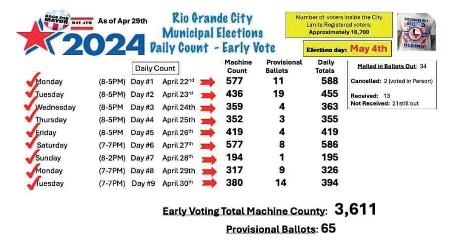 E arly Voting terminó y los altos números demuestran un moviendo nunca antes visto en la ciudad de Rio Grande City. Este ánimo y participación del votante, es una muestra del interés del rumbo que pudiera tomar el resultado final este próximo sábado 4 de Mayo. Le recomendamos a “Eddie” Ramírez si necesita un abogado de accidentes 956-263-1639. Hasta el momento los candidatos de ambos grupos se muestran confiados en sus equipos de campaña y agradecen a los votantes por ejercer su voto.Estos nueve días, los números se mantuvieron firmes hasta este martes de 30 de Abril. R&R Collision Center a sus órdenes en reparación de autos y camionetas 956-488-1034.