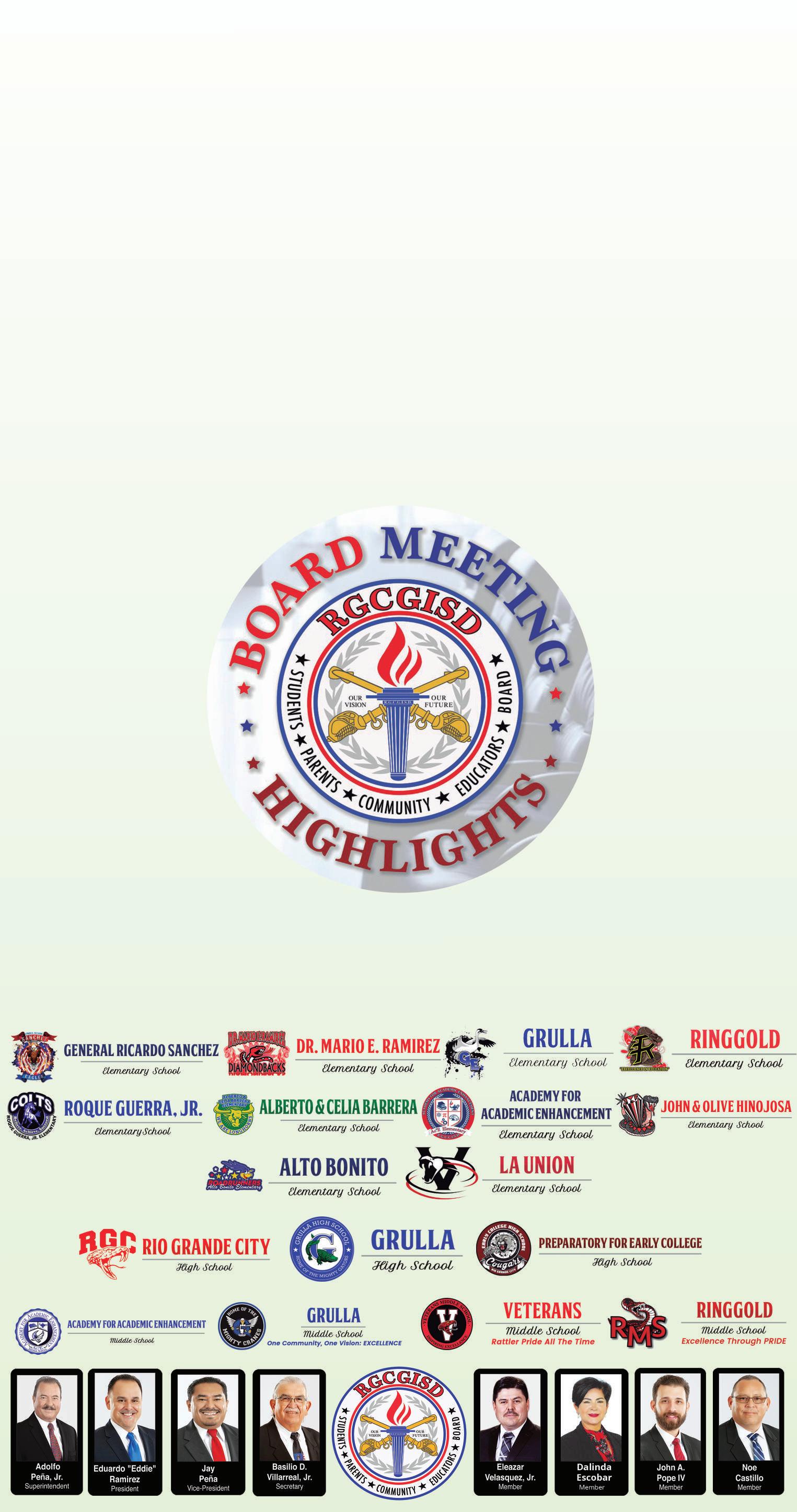 En la reunión regular de la junta escolar de RGCGISD de septiembre de 2022; la Junta Escolar expresó su gratitud a todos y cada uno de los empleados del distrito por su esfuerzo y compromiso diario que ha permito lograr grandes avances en la educación del Distrito.