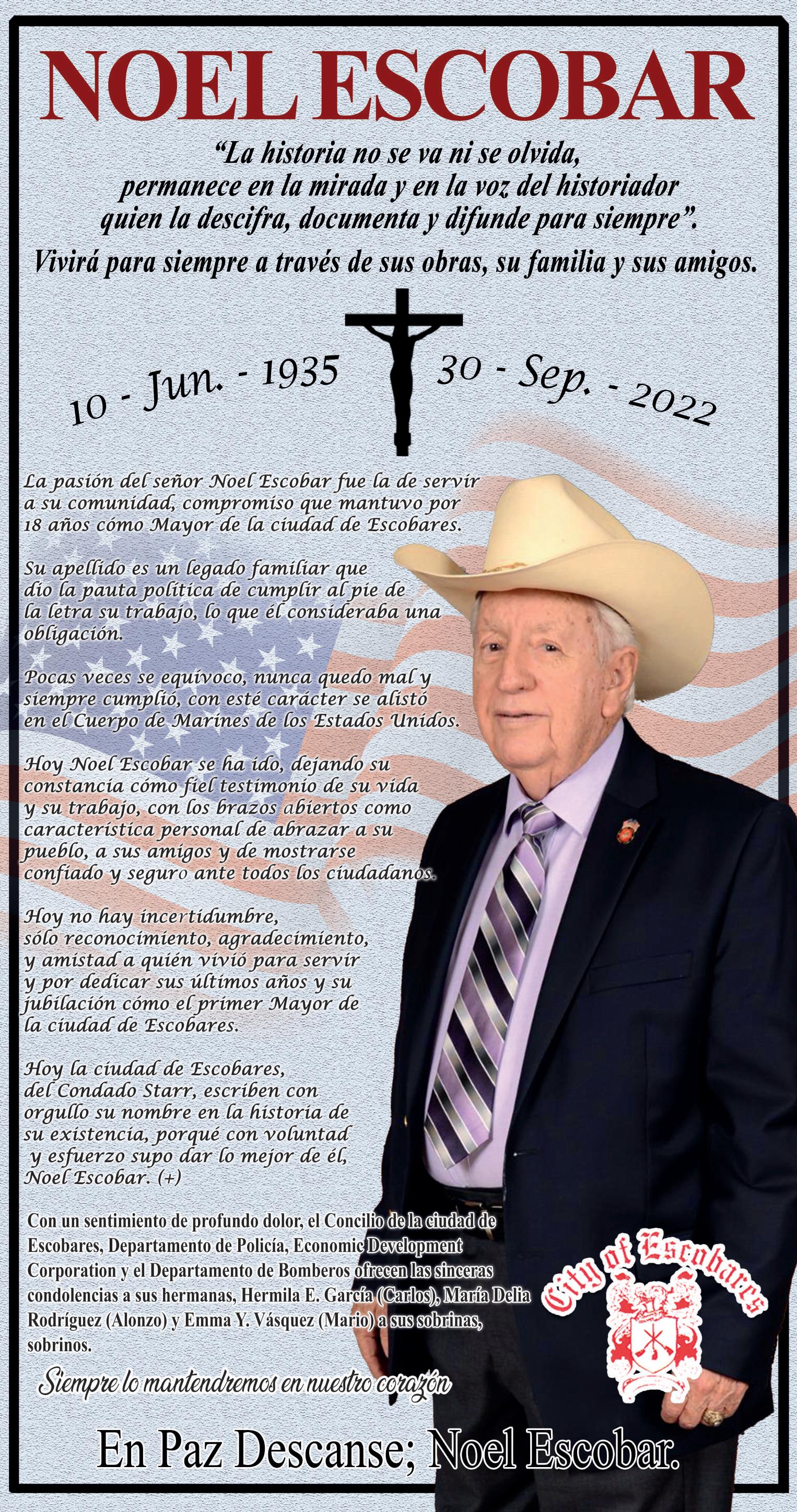A Noel le apasionaba siempre tratar de encontrar formas de brindarles a los ciudadanos de Escobares los mejores servicios que la ciudad podría proporcionar de manera realista. Mientras celebramos su vida, queremos recordarlo a él cómo una persona de haber hecho una diferencia para mejorar la calidad de vida de los ciudadanos de Escobares.