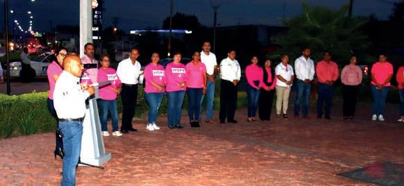 Al encabezar el encendido del listón rosa que enmarca las acciones de la lucha contra el cáncer de mamá en el mes de octubre, el presidente municipal Biol.