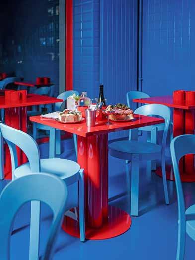 Das Auge schwelgt mit inmitten der komplett in den Farben Rot und Blau gestalteten Einrichtung. Der Boden, die Wände und die Decke sind marineblau, die Stühle himmelblau. Dazwischen stehen die frechen, knallroten Tische. Becher und Teller überraschen in Chromstahl, während Kaffee und Espresso aus roten und blauen Tassen getrunken werden.