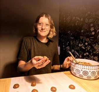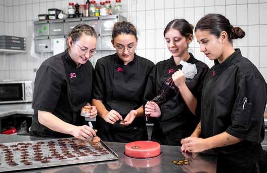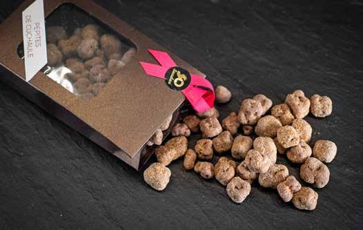 En haut: l'atmosphère est détendue, car tout le monde a plaisir à travailler. En bas: les pépites de cuchaule sont des croûtons de cuchaule caramélisés, enrobés de chocolat.