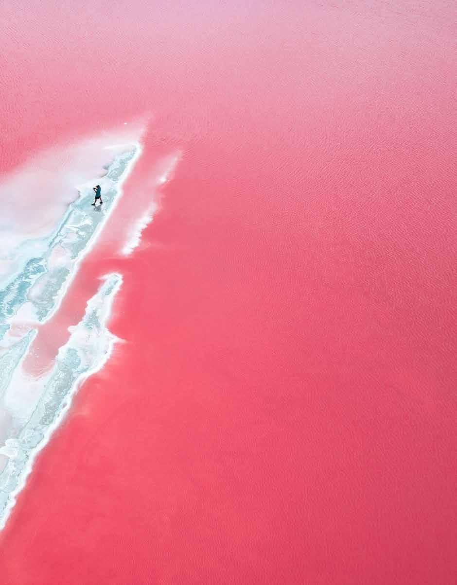La microalgue Dunaliella salina qui vit dans les eaux salées produit du bêtacarotène pour se protéger des rayons du soleil. Ce pigment rouge est à l'origine de la coloration rose de l'eau.