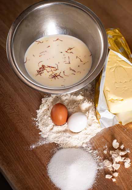 Au fournil, Gérald Saudan a déjà préparé les ingrédients de la pâte à cuchaule. Il prélève tout d'abord des filaments de safran d'un bocal annoté «Safran Bourgeon Bio» et les plonge dans du lait. Il nous ex-