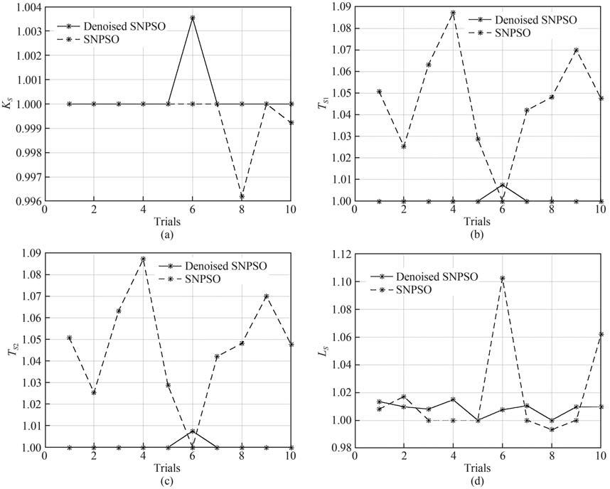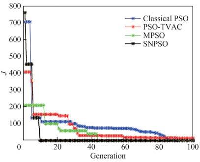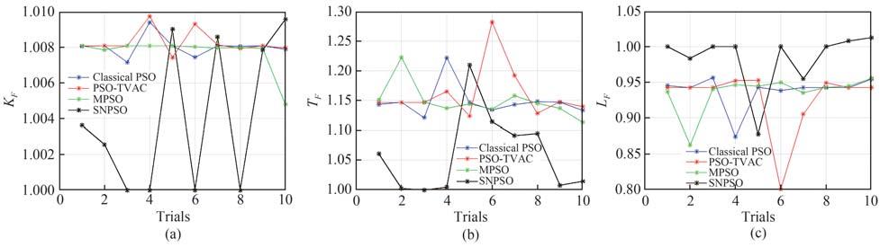 where the parameters KF , TF , and LF are the estimation parameters. The classical PSO, PSO-TAVC, MPSO, and the proposed SNPSO are adopted to identify the selected estimation model. To verify the identification ability of the above algorithms, experiments are conducted at step response with zero noise, step response with Gaussian noise, and denoised step response. When the output y ( t ) is a step response with zero noise (n(t)=0), Table 2 presents the identification accuracy, minimum (min), maximum (max), mean, and standard (std) deviation of the optimal loss function using the four methods ten times, respectively. The accuracy of model identification using the SNPSO algorithm is as high as 90%, which is much higher than the other three algorithms. Fig. 6 illustrates the parameters KF , TF , and LF of the estimation model obtained by running the four algorithms ten times, respectively. The classical PSO, PSO-TAVC, MPSO, and proposed SNPSO algorithms are represented by blue, red, green, and yellow star-lines. SNPSO has excellent average convergence and stability. Fig. 7 illustrates the variations for objective function J using four algorithms. The SNPSO method converges faster and more precisely than other PSO-based algorithms.