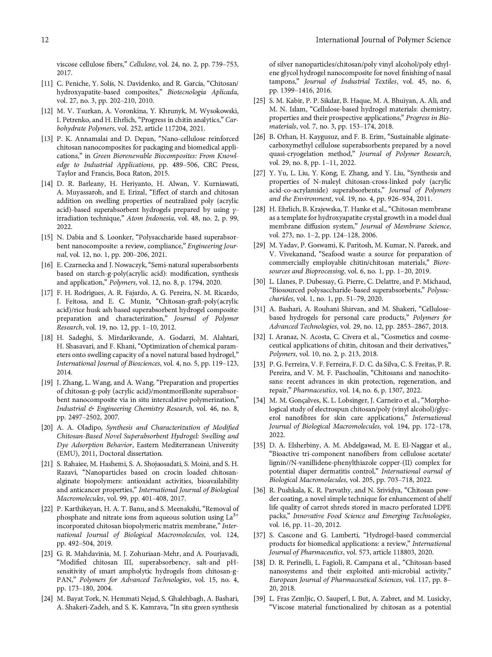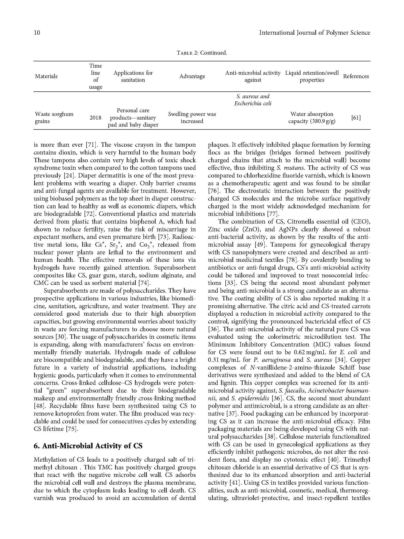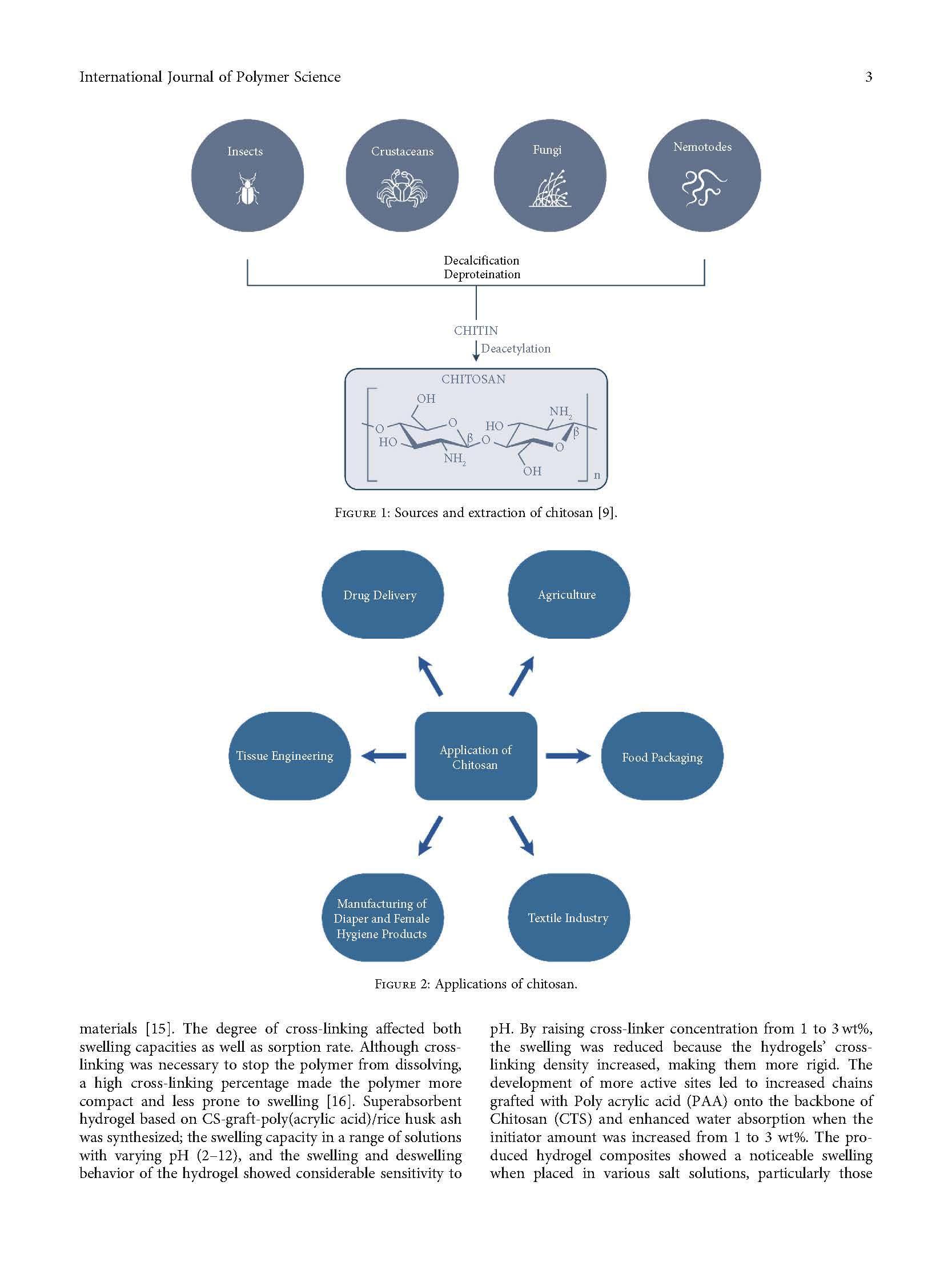 “Chitosan Superabsorbent Biopolymers in Sanitary and Hygiene Applications”, Peenal Arvind Mistry et al, International Journal of Polymer Science , Vol.2023. The consumption of diapers and sanitary products has constantly been rising. Several problems are associated with using chemical-based sanitary products, which are difficult to degrade easily and cause nappy rash and bacterial infections in babies. Therefore, there is an increasing shift towards natural-based sanitary products because of their biodegradability, non-toxicity, and biocompatibility. Several studies are being carried out in which researchers have incorporated natural polymers, such as cellulose, starch, alginate, and xantham gum for producing superabsorbent materials. Chitosan (CS) is one such natural polymer that exhibits anti-microbial activity because of the functional groups present in its structure. Moreover, it is also easily available, biodegradable, and non-toxic. This review mainly focuses on CS’s properties and several approaches to synthesizing natural polymer-based superabsorbent products, such as sanitary pads and diapers. It also briefly discusses the diversified applications of CS as a biopolymer in the cosmetic, medical, food, and textile industries. In addition, this study implies using CS as a superabsorbent biopolymer in the manufacturing and producing sanitary products for women and children. Due to the excellent water retention capacity, swelling ability, and anti-microbial activity exhibited by CS can be considered a potential candidate for producing superabsorbent biopolymers.