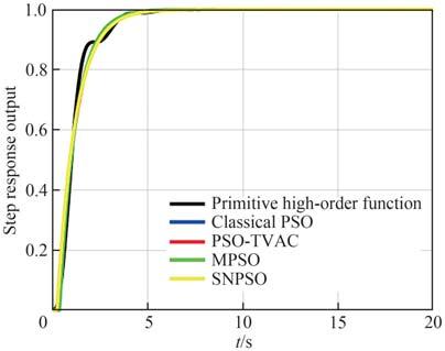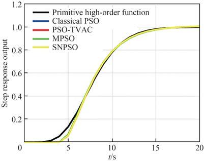 The inclusion of systems P1 and P2 is to confirm that when modeling FOPDT or SOPDT systems with FOPDT or SOPDT models, all the procedures realise an exact match. The identification performance of four algorithms (classical PSO, PSO-TVAC, MPSO, and the proposed SNPSO) is compared. The parameters of four algorithms are set as follows: the sampling time t=20 s; sampling interval t=0.01 s; input is step signal; additive noise is Gaussian white noise with a mean value of 0 and variance of 0.16. The parameters of the four algorithms are presented in Table 1. Matlab R2018a is adopted to perform the above design steps under the environment of Intel(R) Core(TM) i5-4210M CPU@2.60 GHz. In total, 10 independent operations are conducted for each system, and detailed result analysis is described as follows.