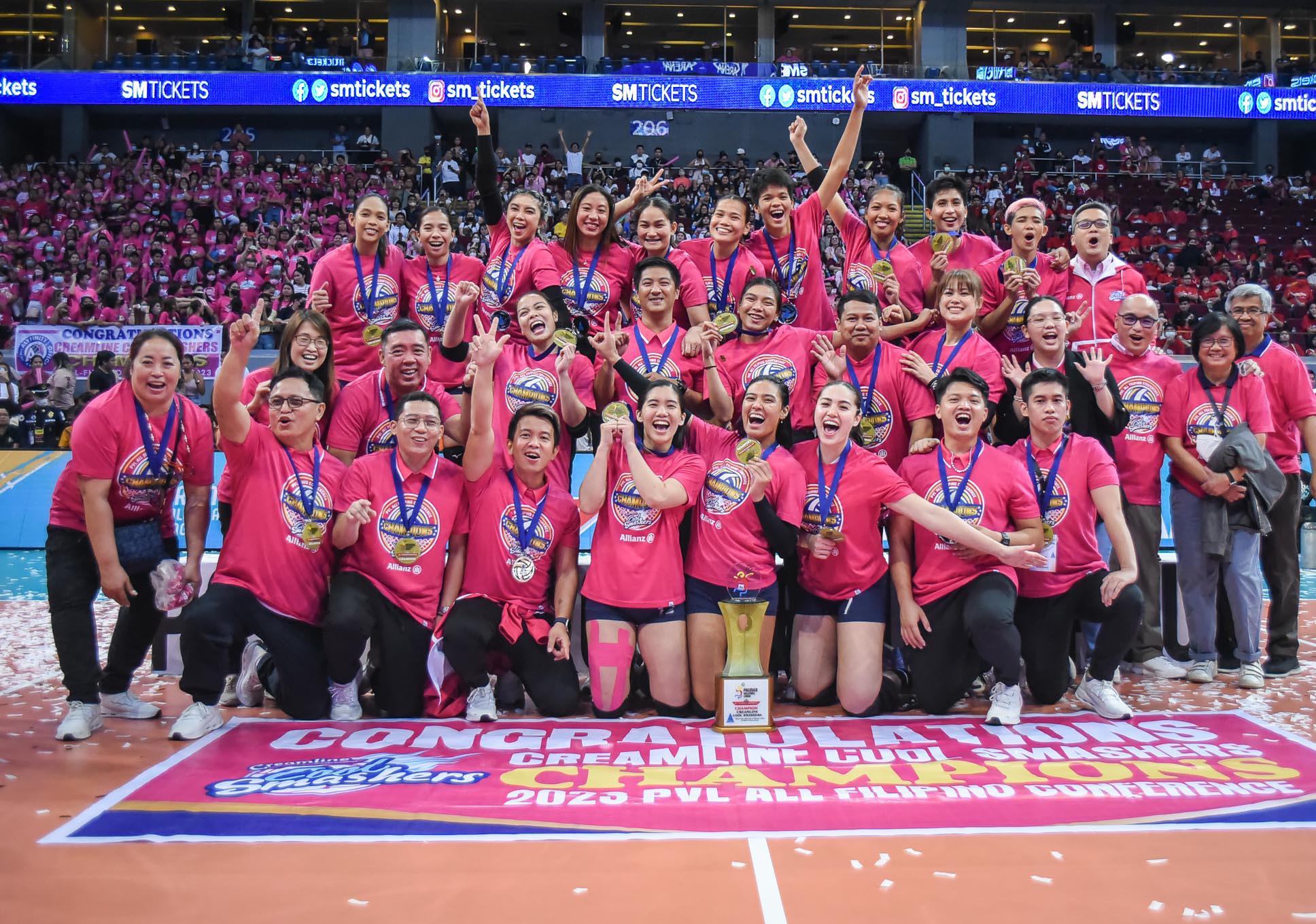 Binuo ang piyesa ng Creamline Cool Smashers matapos nilang isarado ang pinto bilang champions sa 2023 PVL All-Filipino Conference, binatbat ang laro sa 22-25, 25-20, 29-27, 2426, 15-12, sa Smart Araneta Coliseum ngayong Linggo ng Disyembre 16, 2023.