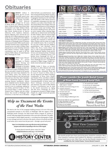Obituaries BRODY: Gilbert S. Brody, age 84, of Scott Township passed away suddenly at his residence on Tuesday, December 25, 2018. Beloved husband for 59 years of Sheila Brody nee Zelkowitz, Devoted father of Marcia Brody, Susan Brody (Julie Nysewander) and Mark (Robyn) Brody. Grandfather of Leo, Blanche, Rachel and Max Brody. Brother-in-law of Marvin Zelkowitz, M.D., Kathleen Zelkowitz, Patricia Zelkowitz, M.D. and the late Leo Zelkowitz, M.D. Gilbert’s greatest joy was his family. He was a graduate of Culver Military Academy Class of 1951. He was a graduate of University of Pittsburgh School of Business and was an avid reader. Gilbert was the owner of Brody’s Furniture Store in McDonald, Pa. Funeral service was held at William Slater Funeral Service, Scott Township. Interment Beth Shalom Cemetery. Family suggests contributions may be made to the Mt. Lebanon Public Library, 16 Castle Shannon Blvd., Pittsburgh, PA 15228. DROZ: Sarah “Minnie” Droz, 97, passed peacefully at Charles Morris Nursing and Rehabilitation Center in Pittsburgh on December 25, having recently been a much-loved resident of Weinberg Terrace. She was preceded in death by her parents, Abraham and Annie Justa; husband of 54 years, Sidney; sisters, Faye Lipman and Dora Baron; brothers, Louis, Sam and Jacob Justa; and son, Alan Droz. Born, November 1, 1921, in Richmond, Virginia, to Yiddishspeaking Russian immigrants, Minnie never completely lost her smooth southern drawl, even when she spoke Yiddish. She learned to sew at a young age, making her own clothes, and loved to dance. In 1931 she married Sidney, a welder working in Newport News, Virginia, and also a great dancer, then moved to Pittsburgh, Sid’s hometown, to raise their sons in Brookline