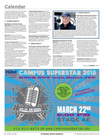 Calendar >> Submit calendar items on the Chronicle’s website, pittsburghjewishchronicle.org. Submissions will also be included in print. Events will run in the print edition beginning one month prior to the date. The deadline for submissions is Friday, noon. q SATURDAY, MARCH 10 Niki Penberg, co-founder of Vegan Pittsburgh, talks about the ease of finding vegan meals at restaurants around the city at 12:30 p.m. at Rodef Shalom Congregation. Participants will sample several dishes from local area restaurants. Visit rodefshalom.org for more information. Game Day from 2 p.m. to 5 p.m. at Moishe House. Who will win the Scrabble Championship? Contact moishehousepgh@ gmail.com for the address. The Taste of Westmoreland is set for 6 p.m. to 8:30 p.m. in the Student Union (Chambers Hall) at the University of Pittsburgh, Greensburg. The cost is $25 and $20 (for advance purchases of 10 or more). Children 12 and under are $10. This is the 25th year that Congregation Emanu-El Israel brings the “Taste� to Westmoreland County. More than 800 people are expected to visit to taste the specialties of some 20 restaurants and caterers of Westmoreland County. Anyone bringing canned and/or nonperishable items for the Westmoreland County Food Bank will receive one free ticket for the raffle basket auction. Visit ceigreensburg.org/taste or call the CEI office at 724-834-0560 for more information.
