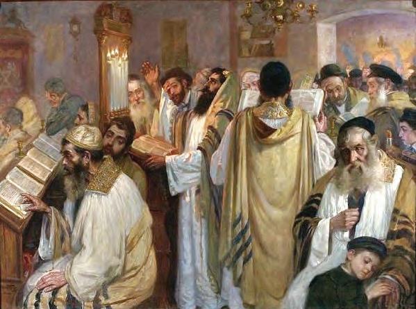 An old woman, also in a tallit, next to whom the main character takes a seat, explains lovingly that Jews confess in plural language.