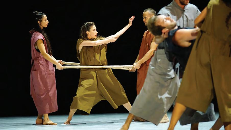 The set and costumes of “Makom” are minimalistic, with an emphasis on the dancers. The set is comprised of wooden sticks forming platforms, ladders and bridges, and the costumes are in neutral hues.