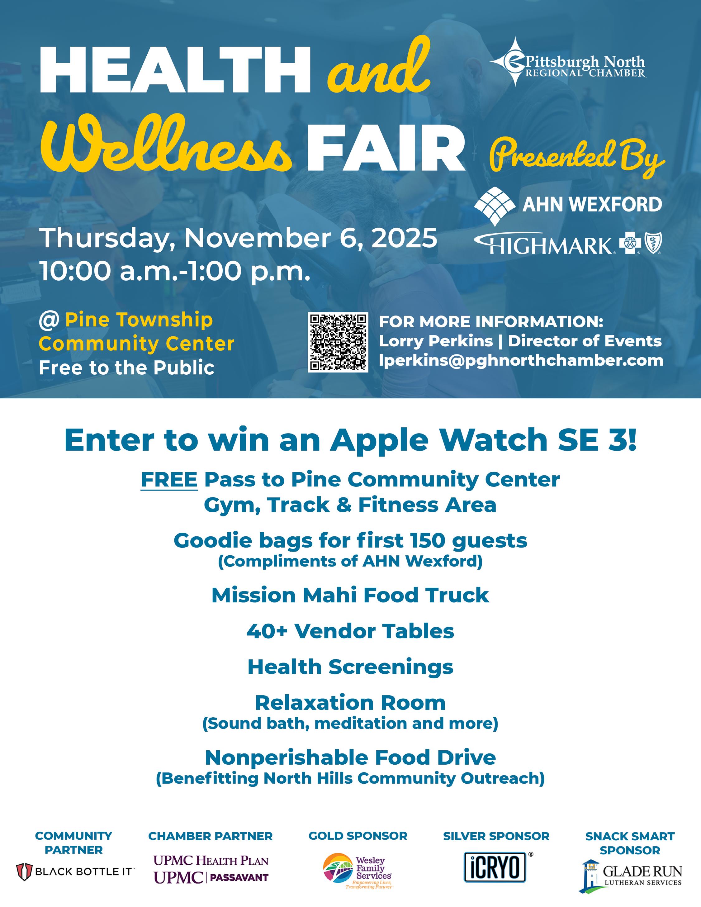 The Pittsburgh North Regional Chamber invites the community to join us for the annual Health & Wellness Fair Presented By AHN Wexford/Highmark on Thursday, November 6, 10:00 a.m.-1:00 p.m., at the Pine Township Community Center. Admission is free and open to the public.