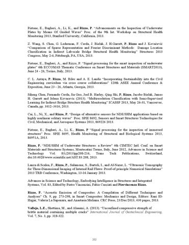 Pistone, E., Bagheri, A., Li, K., and Rizzo, P. “Advancements on the Inspection of Underwater Plates by Means Of Guided Waves” Proc. of the 9th Int. Workshop on Structural Health Monitoring 2013, Stanford University, California, 2013. Z. Wang, S. Chen, G. Lederman, F. Cerda, J. Bielak, J. H.Garrett, P. Rizzo and J. Kovačević “Comparison of Sparse Representation and Fourier Discriminant Methods: Damage Location Classification in Indirect Lab-scale Bridge Structural Health Monitoring” Structures 2013 Congress, May 2-4, Pittsburgh, PA, USA, 2013. Pistone, E., Bagheri, A., and Rizzo, P. “Signal processing for the smart inspection of underwater plates” 6th ECCOMAS Thematic Conference on Smart Structures and Materials (SMART2013), June 24 - 26, Torino, Italy, 2013. C. L. Antaya, P. Rizzo, M. Bilec and A. E. Landis “Incorporating Sustainability into the Civil Engineering curriculum via cross course collaborations” 120th ASEE Annual Conference & Exposition, June 23 - 26, Atlanta, Georgia, 2013. Siheng Chen, Fernando Cerda, Jia Guo, Joel B. Harley, Qing Shi, P. Rizzo, Jacobo Bielak, James H. Garrett and Jelena Kovacevic (2013). “Multiresolution Classification with Semi-Supervised Learning for Indirect Bridge Structure Health Monitoring” ICASSP 2013, May 26-31, Vancouver, Canada, pp. 3412–3416, 2013. Cai, L., Ni, X., and Rizzo, P. “Design of alternative sensors for NDE/SHM applications based on highly nonlinear solitary waves” Proc. SPIE 8692, Sensors and Smart Structures Technologies for Civil, Mechanical, and Aerospace Systems 2013, 869226 2013. Pistone, E., Bagheri, A., Li, K., Rizzo, P “Signal processing for the inspection of immersed structures” Proc. SPIE 8695, Health Monitoring of Structural and Biological Systems 2013, 86951A, 2013. Rizzo, P. “NDE/SHM of Underwater Structures: a Review” 4th CIMTEC Intl. Conf. on Smart Materials and Structures Systems, Montecatini Terme, Italy, June 2012, Advances in Science and Technology Vol. 83,(2013)pp208-216, Trans Tech Publications, Switzerland, doi:10.4028/www.scientific.net/AST.83.208, 2013. Lanza di Scalea, F., Rizzo, P., Salamone, S., Bartoli, I., and Al-Nazer, L. “Ultrasonic Tomography for Three-Dimensional Imaging of Internal Rail Flaws: Proof-of principle Numerical Simulations” 2013 TRB Conference, Washington, 13-16 January 2013. Advances in Science and Technology, Embodying Intelligence in Structures and Integrated Systems, Vol. 83, Edited by Pietro Vincenzini, Fabio Casciati and Piervincenzo Rizzo. Rizzo, P. “Acoustic Emission of Composites: A Compilation of Different Techniques and Analyses” Ch. 9, pp. 273-298, in Smart Composites: Mechanics and Design, Editors: Rani ElHajjar, Valeria La Saponara, and Anastasia Muliana. CRC Press, 23/Dec/2013, 430 pages, 2013. Vallejo, L.E., Shettima, M., and Alaasmi, A. (2013). “Unconfined compressive strength of brittle material containing multiple cracks” International Journal of Geotechnical Engineering, Vol. 7, No. 3, pp. 318-322.