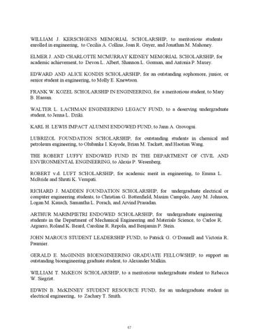 WILLIAM J. KERSCHGENS MEMORIAL SCHOLARSHIP, to meritorious students enrolled in engineering, to Cecilia A. Collins, Joan R. Guyer, and Jonathan M. Mahoney. ELMER J. AND CHARLOTTE MCMURRAY KIDNEY MEMORIAL SCHOLARSHIP, for academic achievement, to Devon L. Albert, Shannon L. Gorman, and Antonia P. Maxey. EDWARD AND ALICE KONDIS SCHOLARSHIP, for an outstanding sophomore, junior, or senior student in engineering, to Molly E. Knewtson. FRANK W. KOZEL SCHOLARSHIP IN ENGINEERING, for a meritorious student, to Mary B. Hassan. WALTER L. LACHMAN ENGINEERING LEGACY FUND, to a deserving undergraduate student, to Jenna L. Dziki. KARL H. LEWIS IMPACT ALUMNI ENDOWED FUND, to Jann A. Grovogui. LUBRIZOL FOUNDATION SCHOLARSHIP, for outstanding students in chemical and petroleum engineering, to Olubanke I. Kayode, Brian M. Tackett, and Haotian Wang. THE ROBERT LUFFY ENDOWED FUND IN THE DEPARTMENT OF CIVIL AND ENVIRONMENTAL ENGINEERING, to Alexis P. Wesenberg. ROBERT v.d. LUFT SCHOLARSHIP, for academic merit in engineering, to Emma L. McBride and Shruti K. Vempati. RICHARD J. MADDEN FOUNDATION SCHOLARSHIP, for undergraduate electrical or computer engineering students, to Christian G. Bottenfield, Maxim Campolo, Amy M. Johnson, Logan M. Kausch, Samantha L. Porach, and Arvind Prasadan. ARTHUR MARIMPIETRI ENDOWED SCHOLARSHIP, for undergraduate engineering students in the Department of Mechanical Engineering and Materials Science, to Carlos R. Arguero, Roland K. Beard, Caroline R. Repola, and Benjamin P. Stein. JOHN MAROUS STUDENT LEADERSHIP FUND, to Patrick G. O’Donnell and Victoria R. Paumier. GERALD E. McGINNIS BIOENGINEERING GRADUATE FELLOWSHIP, to support an outstanding bioengineering graduate student, to Alexander Malkin. WILLIAM T. McKEON SCHOLARSHIP, to a meritorious undergraduate student to Rebecca W. Siegrist. EDWIN B. McKINNEY STUDENT RESOURCE FUND, for an undergraduate student in electrical engineering, to Zachary T. Smith.