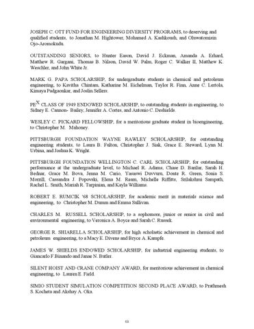JOSEPH C. OTT FUND FOR ENGINEERING DIVERSITY PROGRAMS, to deserving and qualified students, to Jonathan M. Hightower, Mohamed A. Kashkoush, and Oluwatomisin Ojo-Aromokudu. OUTSTANDING SENIORS, to Hunter Eason, David J. Eckman, Amanda A. Erhard, Matthew R. Gargani, Thomas B. Nilson, David W. Palm, Roger C. Walker II, Matthew K. Weschler, and John White Jr. MARK G. PAPA SCHOLARSHIP, for undergraduate students in chemical and petroleum engineering, to Kavitha Chintam, Katharine M. Eichelman, Taylor R. Finn, Anne C. Lertola, Kimaya Padgaonkar, and Joslin Sellers. PEX CLASS OF 1949 ENDOWED SCHOLARSHIP, to outstanding students in engineering, to Sidney E. Cannon- Bailey, Jennifer A. Cortes, and Antonio C. Deshields. WESLEY C. PICKARD FELLOWSHIP, for a meritorious graduate student in bioengineering, to Christopher M. Mahoney. PITTSBURGH FOUNDATION WAYNE RAWLEY SCHOLARSHIP, for outstanding engineering students, to Laura B. Fulton, Christopher J. Siak, Grace E. Steward, Lynn M. Urbina, and Joshua K. Wright. PITTSBURGH FOUNDATION WELLINGTON C. CARL SCHOLARSHIP, for outstanding performance at the undergraduate level, to Michael R. Adams, Chase D. Barilar, Sarah H. Bednar, Grace M. Bova, Jenna M. Cario, Yasaswi Duvvuru, Donte R. Green, Sonia S. Morrill, Cassandra J. Popovski, Elena M. Ream, Michelle Riffitts, Srilakshmi Sampath, Rachel L. Smith, Mariah R. Tarpinian, and Kayla Williams. ROBERT E. RUMCIK '68 SCHOLARSHIP, for academic merit in materials science and engineering, to Christopher M. Dumm and Emma Sullivan. CHARLES M. RUSSELL SCHOLARSHIP, to a sophomore, junior or senior in civil and environmental engineering, to Veronica A. Boyce and Sarah C. Russek. GEORGE R. SHIARELLA SCHOLARSHIP, for high scholastic achievement in chemical and petroleum engineering, to a Macy E. Divens and Bryce A. Kampfe. JAMES W. SHIELDS ENDOWED SCHOLARSHIP, for industrial engineering students, to Giancarlo F.Binando and Janae N. Butler. SILENT HOIST AND CRANE COMPANY AWARD, for meritorious achievement in chemical engineering, to Lauren E. Field. SIMIO STUDENT SIMULATION COMPETITION SECOND PLACE AWARD, to Prathmesh S. Kocheta and Akshay A. Oka.