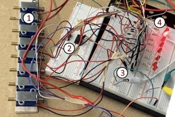 Figure 4. Testing the 8 by 1 solenoid grid. 1. 12V Push-Pull solenoid, 2. Breadboard and shift register, 3. MOSFETS, diodes, 12V power supply, 4. LED to help visualize which solenoid is turned on. Note the difference between the on solenoid (second from top), and the remaining off solenoids. The plunger in the on solenoid has extended outwards.