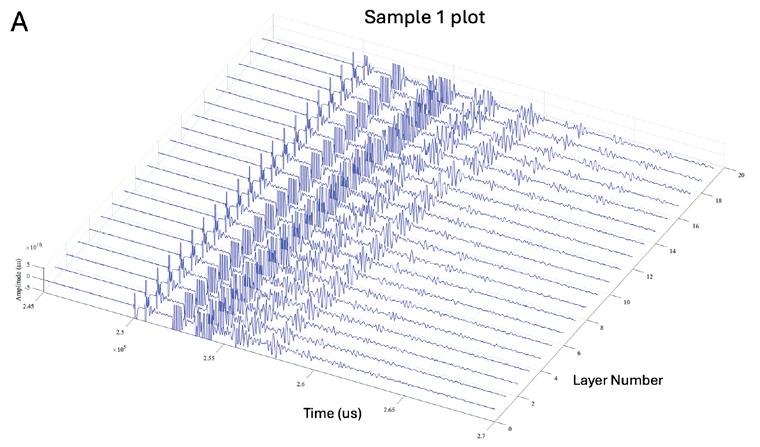 In-situ data from each print was analyzed in MATLAB to track ToF changes across 20 layers. The first two amplitude spikes in all three plots remained constant due to interference from the print head. The third spike, caused by the sample, shifted further away as ToF increased with increasing thickness. Initial ToF values differed per sample, with smaller ones indicating thinner layers and vice versa.