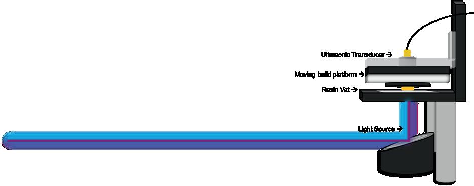 Figure 5 shows the in-situ resin printing setup. The UV and Blue light converge in a reflective box to form the DLP beam, which is directed towards a slanted mirror to reflect onto the resin vat. A total of 2.5 mL of resin was poured into the vat, and the moving print platform was lowered until it contacted the resin. A small mirror placed below the vat was used to check for potential air bubbles forming from the print head touched the resin. The Ultrasonic Transducer is connected to the oscilloscope to gather real time data, which is then uploaded to a computer. The data is then processed and analyzed using MATLAB.
