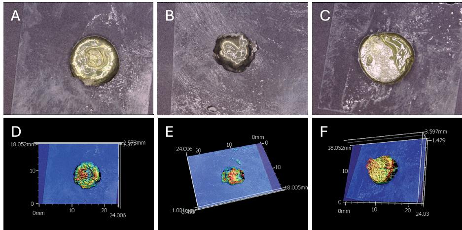 After printing, the three samples exhibited significantly different appearances. As shown in Figure 6A , sample 1 retained a consistent round shape but failed to cure in the middle forming an almost donut-like appearance. Sample 2 (Figure 6B) cured poorly, leading to unstable integrity and an inconsistent shape. Sample 3 (Figure 6C) demonstrated the performance, printing a very strong and sturdy round shape. A Keyence machine measured the thicknesses in a noninvasive manner to prevent sample damaging and give precise imaging of the deformities. Sample 1 printed a final thickness of 2.578 mm, sample 2 printed 0.986 mm, and sample 3 printed 3.597mm.