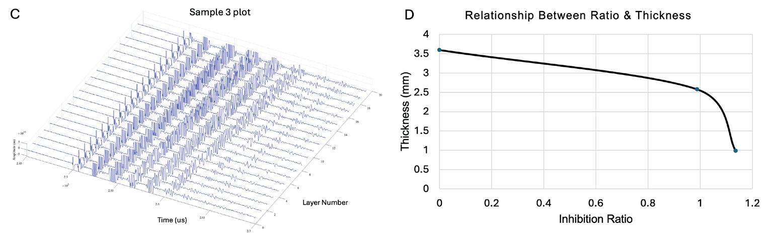 In contrast, Sample 2, with the highest inhibition ratio (1.1362) created very poor print integrity and small thickness. Figure 7B shows narrowly spaced ToF amplitudes, indicating thin layers with this ratio. Material quality resembled that of Jello contrasting Sample’s 3 sturdy rubber consistency. While not sounding ideal, this could be useful for applications requiring soft prints, such as artificial organs.