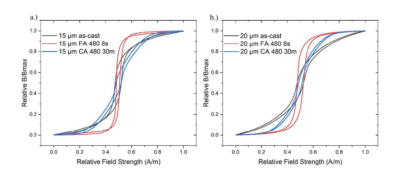 The goal of this experiment is to show the change in properties between flash annealing and conventional annealing, as well as quantitatively compare the different properties obtained based on ribbon thickness. The proposed hypothesis is due to the high heating rates, FA has a wider tunability of properties for optimization compared to CA and that the 15 μm ribbons will display lower losses but similar coercivities and permeabilities as the 20 μm ribbons.