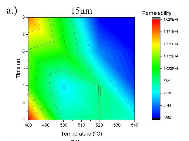 The magnetic properties of the flash annealed samples were analyzed with heat maps based on the time, temperature, and chosen magnetic properties. The conditions used for these heat maps were at 2000Hz and 0.5T for permeability, and 2000Hz and 1000A/m for coercivity seen in figures 2a-d. Tunability of different properties based on different conditions is shown as well, seen by the wide range of values in the heat maps. The desired magnetic properties of the ribbons include low coercivity, high permeability, and low losses. Fitting the desired parameters, ideal annealing conditions for both the 15 μm and 20 μm ribbons were determined to be FA at 480ºC and for 8 seconds.