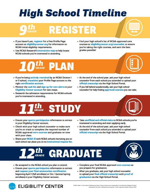 • File NCAA Clearinghouse form if you hope to play Division I or Division II sports in college.