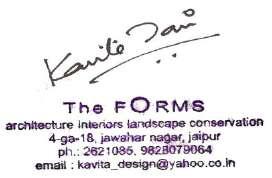 The ‘F O R M S’ architecture interiors landscape conservation 4-Ga-18, Jawahar Nagar, Jaipur, (Raj.) INDIA Ph: 91 141 2652980, 098280 79064, 098280 20300 e mail: kavita_design@yahoo.co.in
