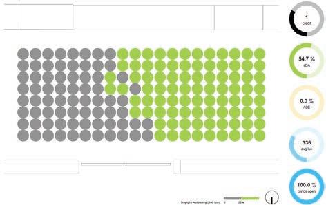 0 3000 DAYLIGHT Useful Daylight Illuminance(UDI) is defined 516 lux on the floor plane which causes glare and overlighting of the space. GLARE 0 5 1% Disturbing glare is intercepted near the window at peak hours. 0 3000 ILLUMINANCE A mean of 250 lux of illuminance is achieved when the flasher is slided. The capture area faces overlighting.. 77.8% of quality view is achieved when the flasher is opened. Thus it can be slided open to offer views to the user when not in use. VIEW 200 Time Day 11 12 13 14 15 16 17 18 19 20 FLASHER SLIDED STATE 3000 FLASHER OPEN STATE Useful Daylight Illuminance (UDI) is defined 299lux on the floor plane which is optimal for the space. 13.9% sDA is also achieved. DAYLIGHT GLARE 5 0.3% disturbing glare is intercepted near the window at peak hours during summer months of april and may annually. 3000 ILLUMINATION A mean of 115lux of illuminance is achieved when the flasher is open. The capture area faces optimal lighting. VIEW The product tends to provide blocked views in its open state. Time Day 16 3000 0 3000 DAYLIGHT GLARE ILLUMINATION VIEW FLASHER CLOSED STATE Useful Daylight Illuminance (UDI) is defined 516lux on the floor plane which leads to glare. 38.9% sDA is also achieved. 1.7% disturbing glare is intercepted near the window at peak hours during summer months of april and may annually. A mean of 260 lux of illuminance is achieved when the flasher is closed The capture area faces optimal lighting. The product tends to provide obstructed views in its closed state. Fig : Daylight Fig : Glare Fig Illumination Fig View Fig