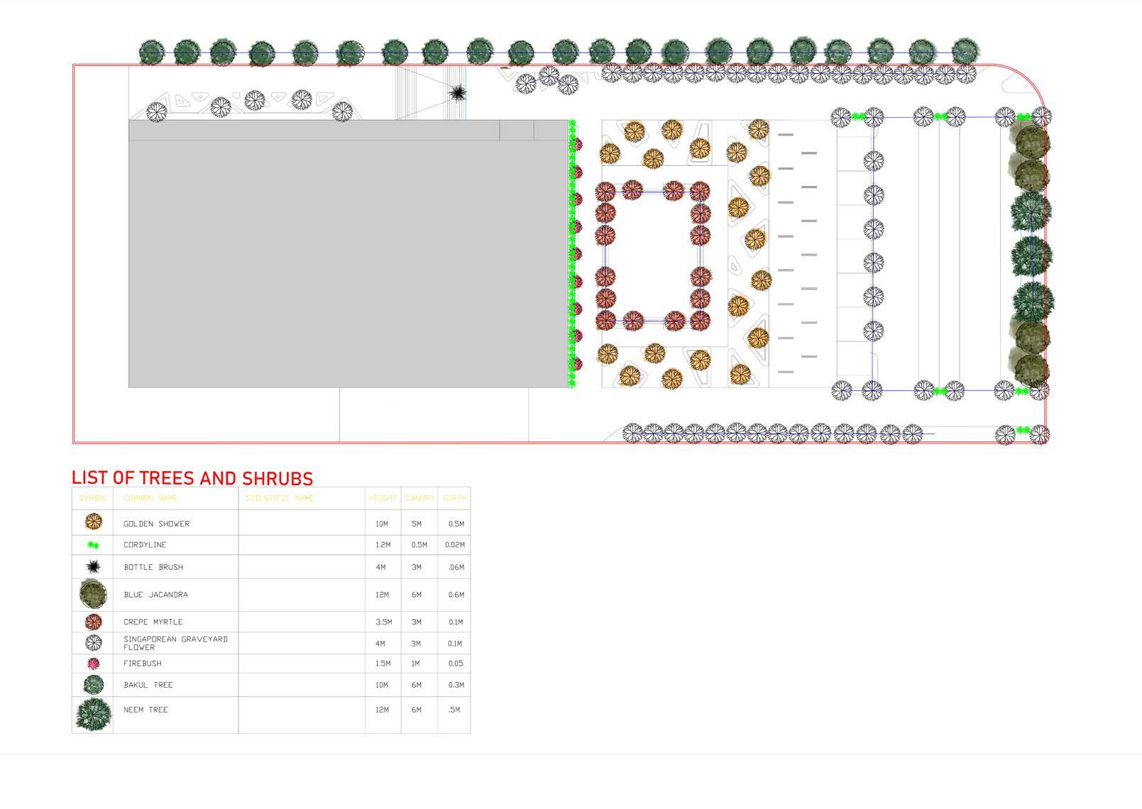 GOLDEN SHOWER Cassia fistula Callistemon Jacaranda mimosifolia Lagerstroemia Plumeria obtusa Hamelia patens Mimusops elengi Azadirachta indica Cordyline fruticosa BOTTLE BRUSH CREPE MYRTLE NEEM TREE BLUE JACANDRA BAKUL TREE FIREBUSH SINGAPOREAN GRAVEYARD FLOWER SELECTED WORK | LANDSCAPE DESIGN
