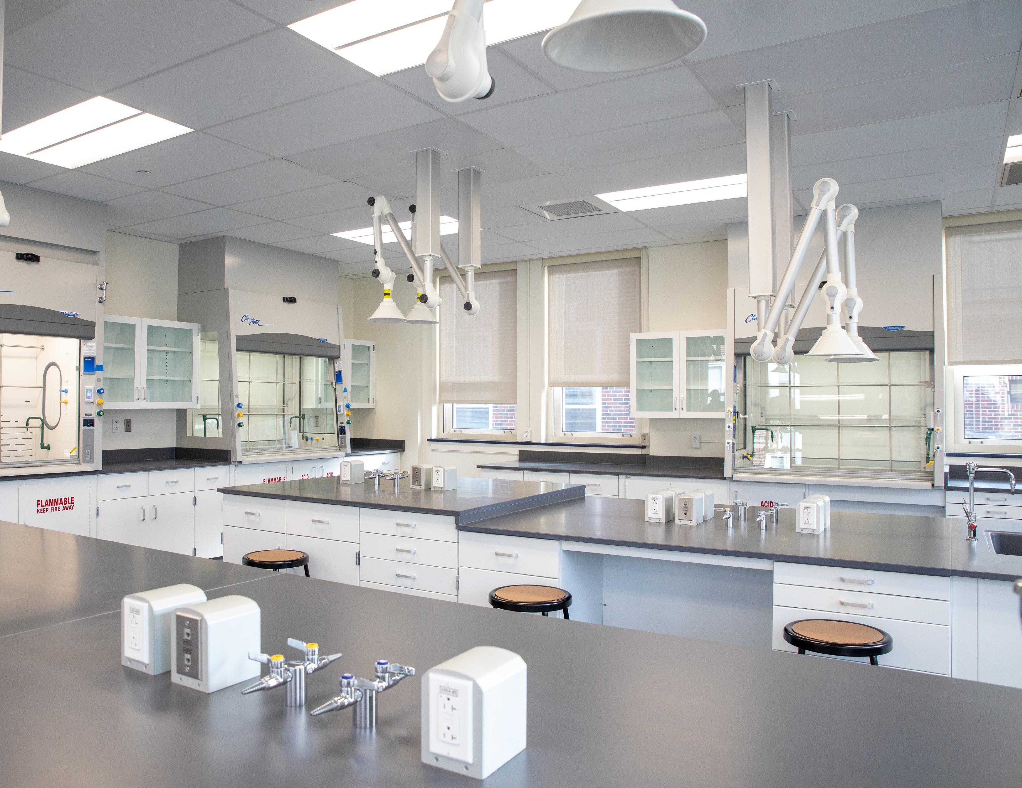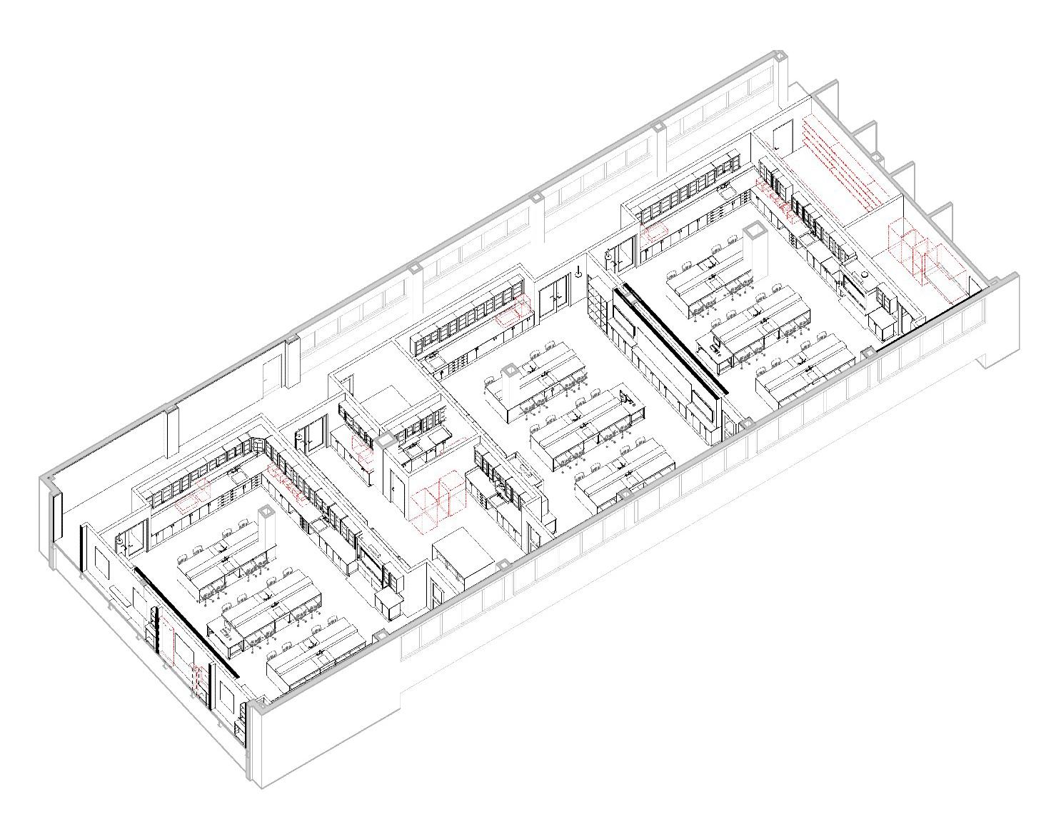 Revisions included finish upgrades along with spatial reconfiguration. The lab spaces feature new mechanical, electrical, plumbing and sprinkler systems as well as new casework and fume hoods.