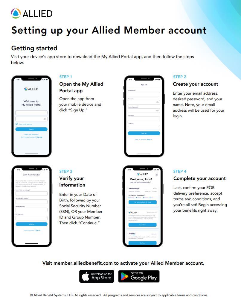 Once the plan year begins, you can call Allied at 800.621.0748 with any claims or benefit coverage questions. Visit www.member.alliedbenefit.com to establish an account or download the MyAllied App.
