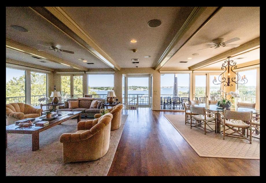an incredible view, with floor-to-ceiling windows that provide a 270-degree view of the property and lake The home is situated in a forest of mature oak and cedar trees, which provide the treehouse illusion.