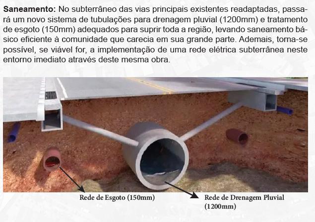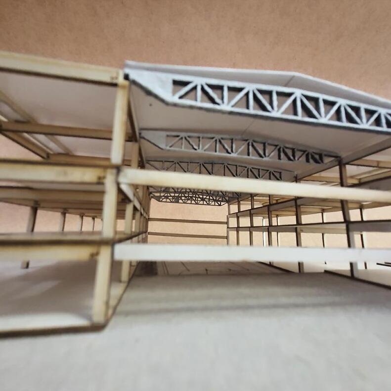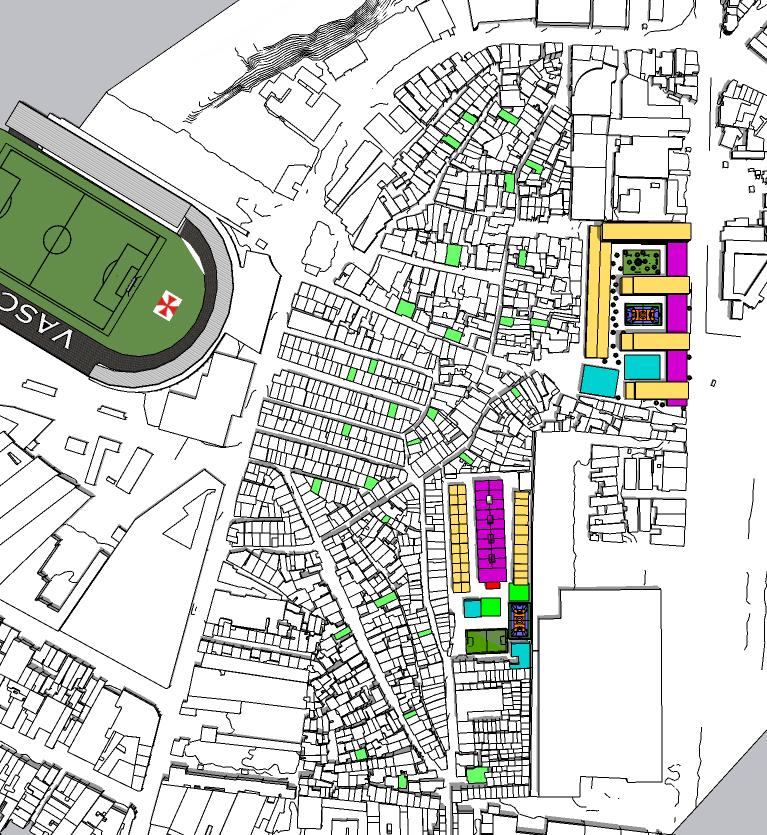 A quadra esportiva está no eixo central do nosso projeto, pois é ela quem delimita os espaços da escola. Portanto, é nas laterais dessa quadra que encontramos as duas lâminas voltadas para o programa formal da escola, o ambiente da aprendizagem. E margeando estas lâminas é onde encontramos toda a área de convivência do projeto, o externo.