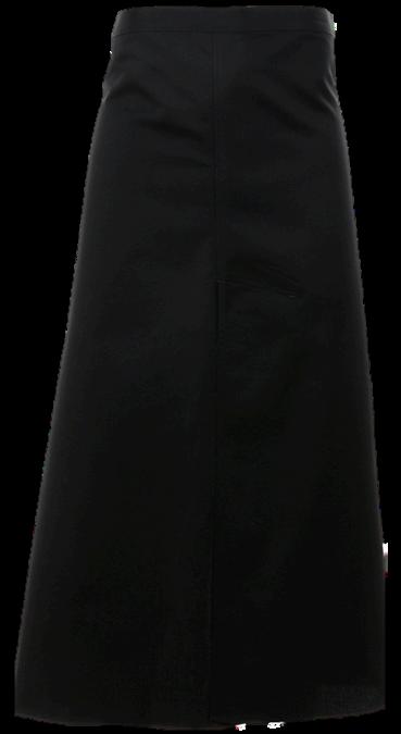 Klassinen pitkä essu, jossa edessä samasta materiaalista valmistettu solmittava nauha.