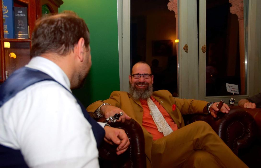Nun wurden die Zigarren verteilt, von den Wettbewerberinnen und Wettbewerberngenauestensgeprüft.Danndas Zeichen zum Cutten. Eine Minute hat man hierfür, und nun kann das letzte maldieZigarregetauschtwerden,weil sievielleichtnichtwiegewünschtzieht. Der Startschuss, mit den zwei Streichhölzern hat man nun eine Minute Zeit dieZigarrezuentzünden.IndieserZeit läuftschondieUhr,unddasSchweigen. Denn in den ersten 5 Minuten wird wedergesprochennochgetrunken.Die ersten 40 Minuten muss die Asche halten, sonst gibt es Zeitabzug, ausgehendarfdieZigarreehnicht.Undso wurde es ein lustiger Wettbewerb in dem man dem Kontrahenten genauestens auf den Mund und die Finger schaute. Zum Schluss, wir waren über dieersteStunderaus,warennochzwei Fighter im Rennen. Präsident und Mitbegründer des G C Gentlemen’s Clubs Kevin Clemen aus Eisenach lieferte sich ein Kopf an Kopf Rennen mit Thomas Raich aus Würzburg Thomas Raich konnte dieses für sich entscheiden und kam auf eine Gesamtheitvon100:35.Da16Minuten abgezogen wurden kam Raich auf 84:35. Kevin Clemen ging bei 71:29 aus dem Rennen, was nachAbzug der Strafzeiten 68:29 bedeutete. Auf dem