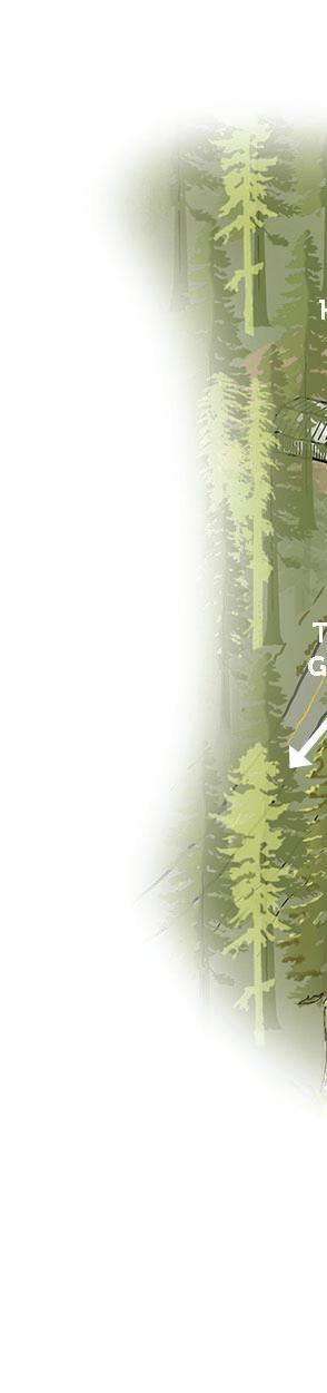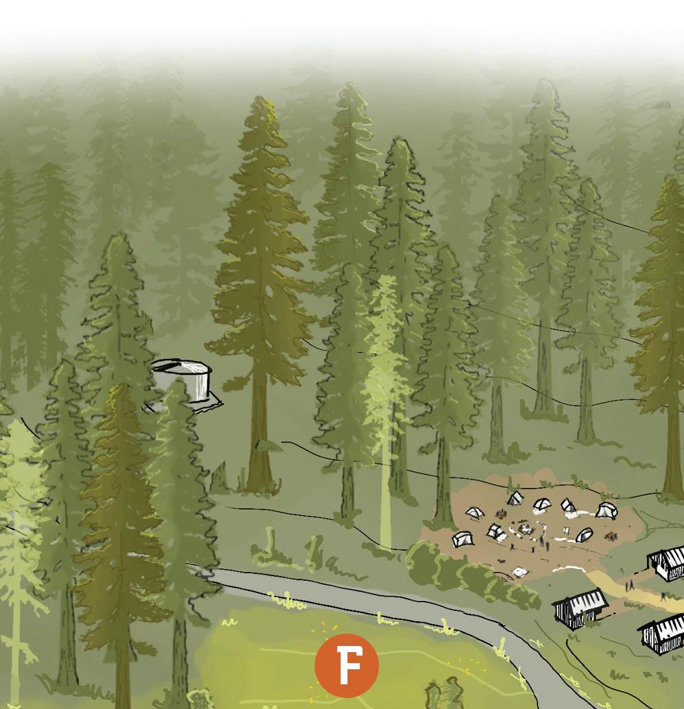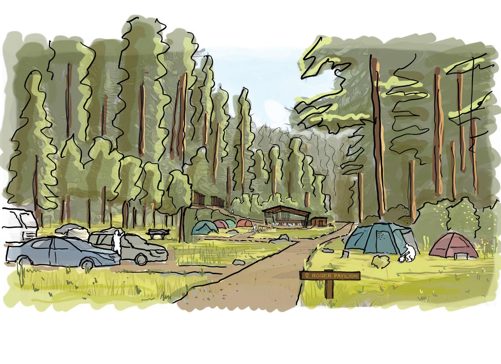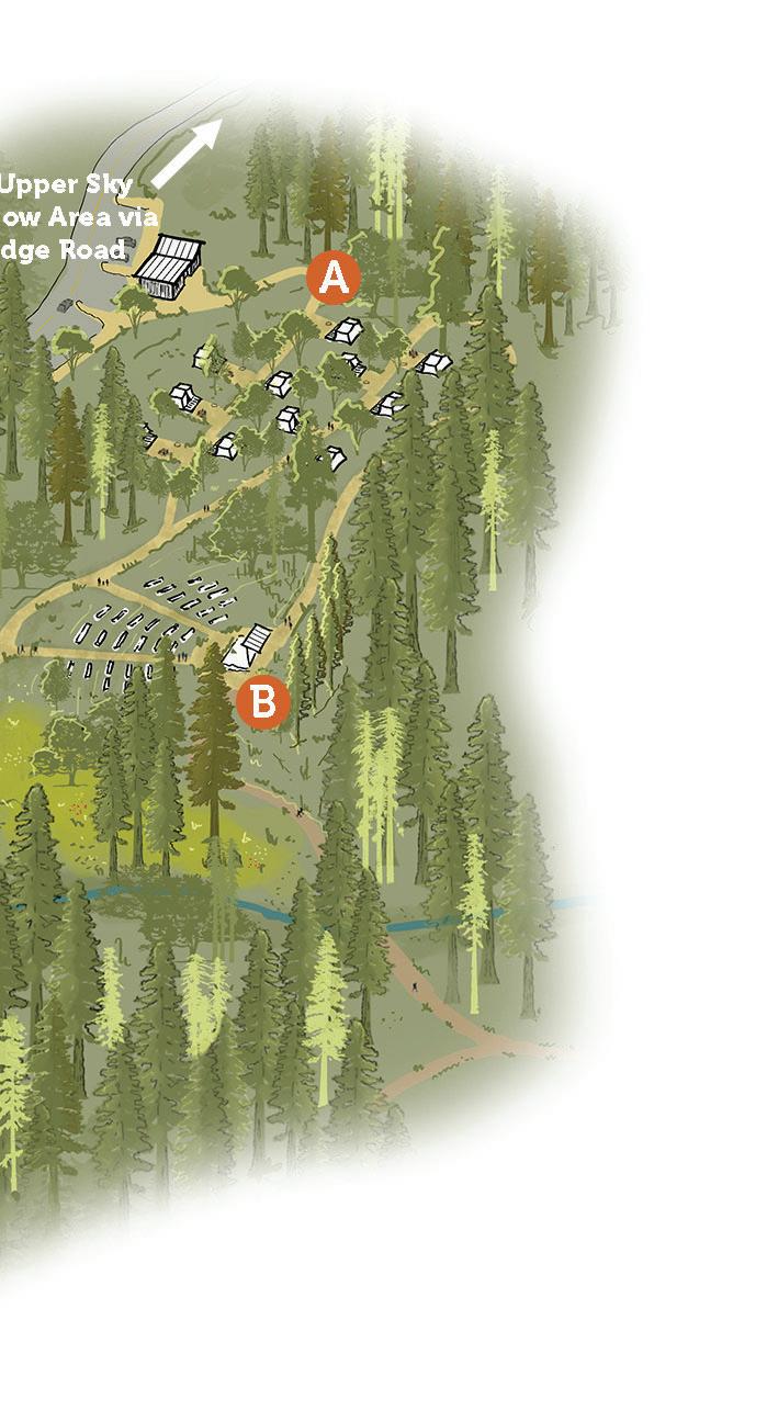 During this phase, additional visitor-serving facilities and overnight accommodations at both the core Overnight Area and beyond will be reestablished to support a broader range of recreational activities and camping experiences. This includes campsites, cabins, and supportive campground facilities at the Lower Sky Meadow Area and overnight and interpretive facilities at Little Basin. The Little Basin Stewardship and Cultural Center will be established to honor Indigenous stewardship and promote traditional ecological knowledge. At the same time, connectivity between key areas of the park will increase as a new shuttle stop at Gatehouse and improved trail connectivity will increase options for one-way hikes. The expanded shuttle system will have the added benefit of reducing traffic congestion and minimizing environmental impact.