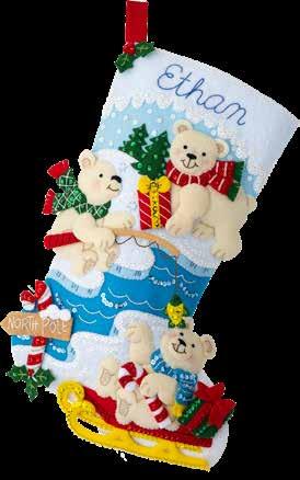 89328E Storytime Bears 27 86710I/86710 Christmas Tree Surprise With string lights* Kit includes bonus ornament 86815 Holiday Teddy Kit includes bonus ornament *2 AA batteries required. Batteries not included. consumers: 800-842-4197 wholesalers: 800-842-4196 Stockings 18 in felt appliqué
