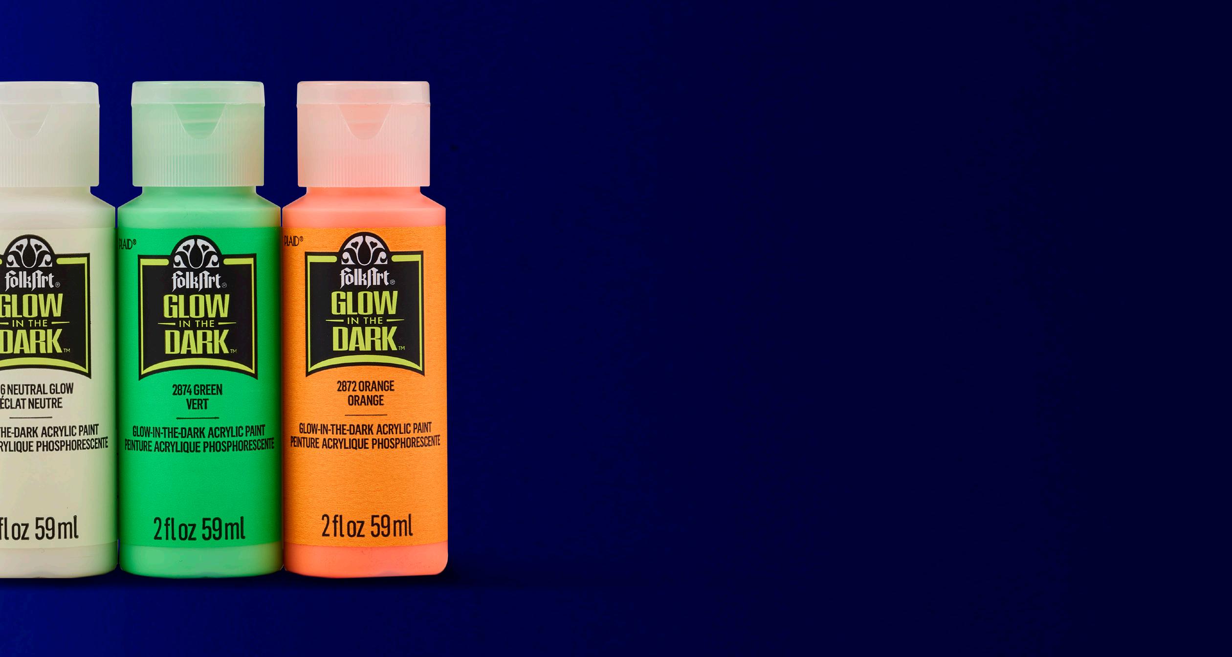 FolkArt Glow-in-the-Dark acrylic paint bright neon colors pop in the daylight and glow brightly once charges with the sun, indoor light, or a black light. Basecoat with white paint or add multiple coats to achieve desired results.