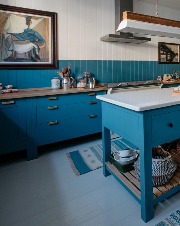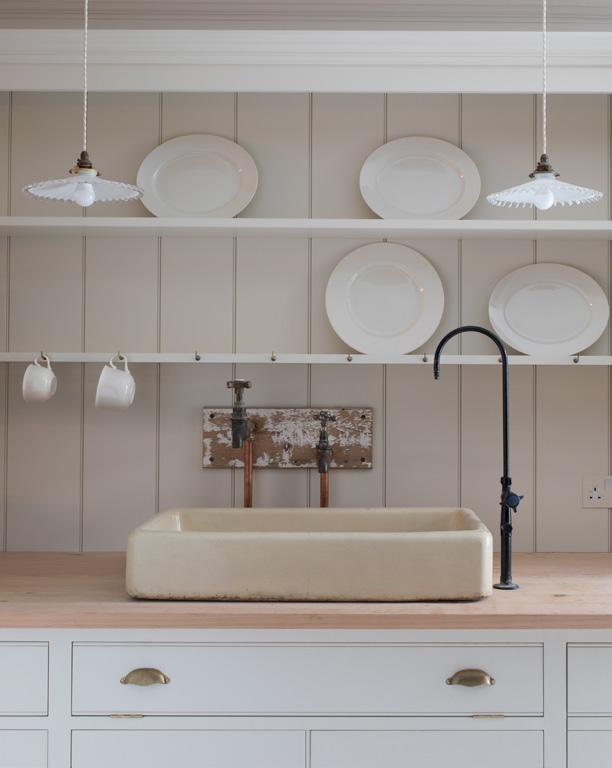 The dresser accommodates an everchanging exhibition of antique china and vintage finds. A reclaimed sink sits on the worktop to preserve the feeling of a freestanding piece of furniture.