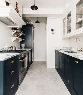 A small Manhattan kitchen which packs a lot in. Above the dark band of floor cupboards, light bounces off the pale walls. The glazed wall cupboards and Arabescato marble enhance the sense of space.