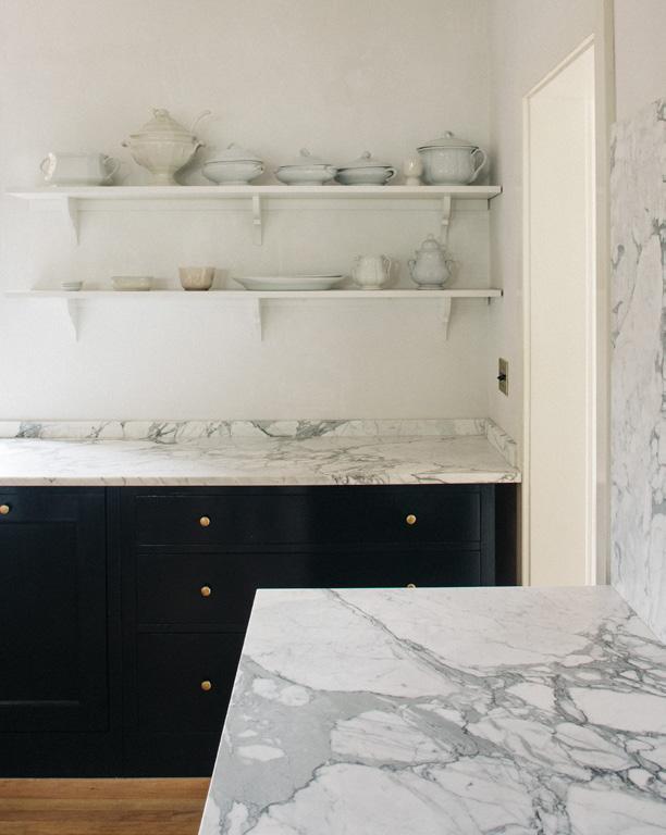 The osea island in this New York kitchen has a honed black granite worktop as a calming contrast to the vibrancy of the Bianco Eclipsia quartzite on the main run. Apart from the canopy, the walls were left clear for art and to create an uncluttered feel in the high-ceilinged room.