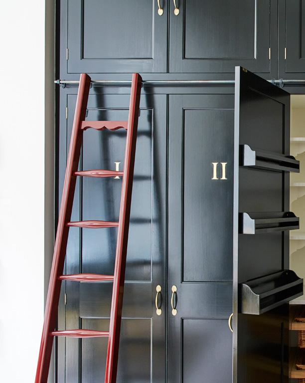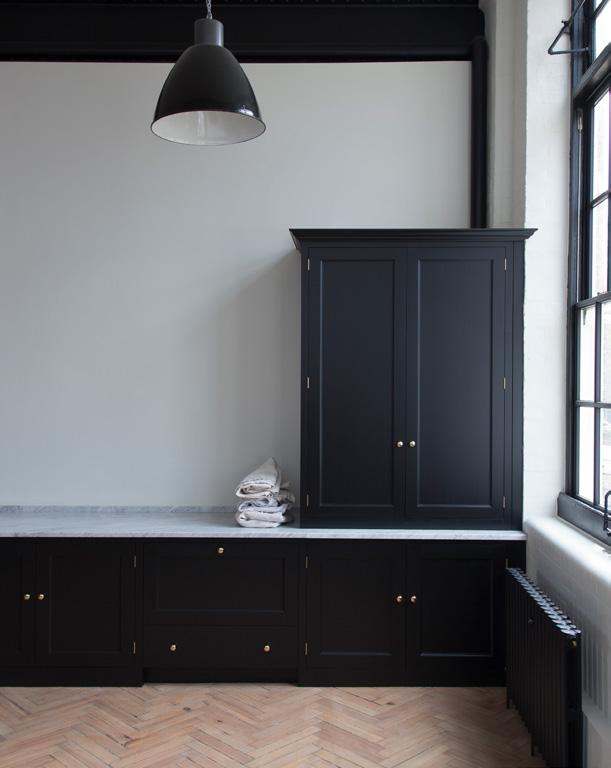 The choice of ironmongery is critical as it transforms the character of an installation. For this project we designed our own handle based on an example from a jeweller’s shop in London, a shapely and playful contrast to the austerity of the tall brown cupboards. We call this handle the bond street latch.