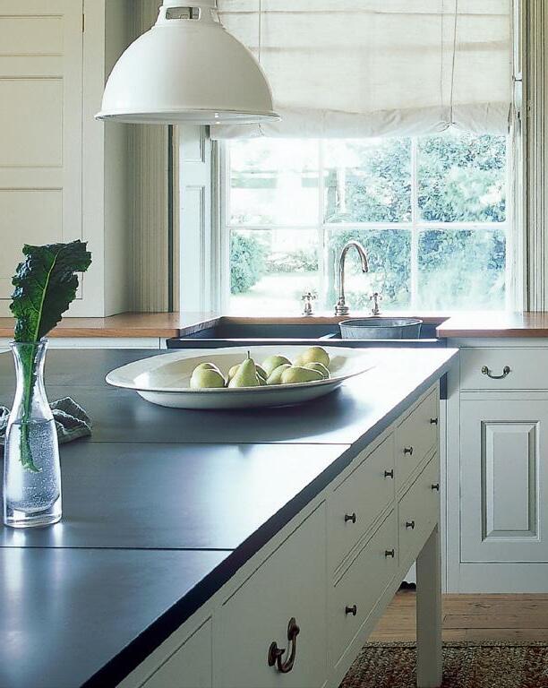 Our large worktable is the centrepiece for family gatherings in this historic 19 th Century house in New England. The bold marble continues into the sink and the grey streaks are picked up by the glossy coal scuttle colour of the floor cupboards.