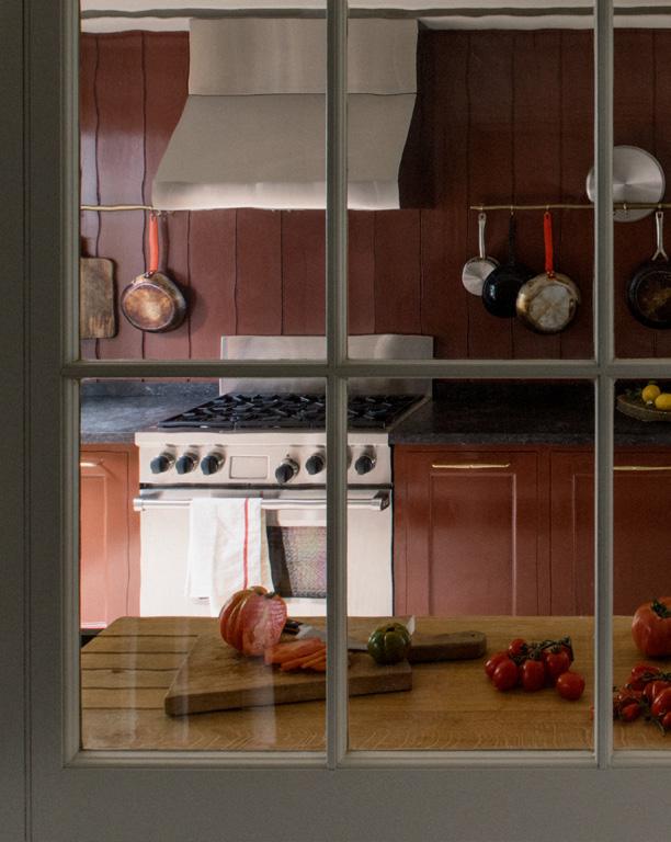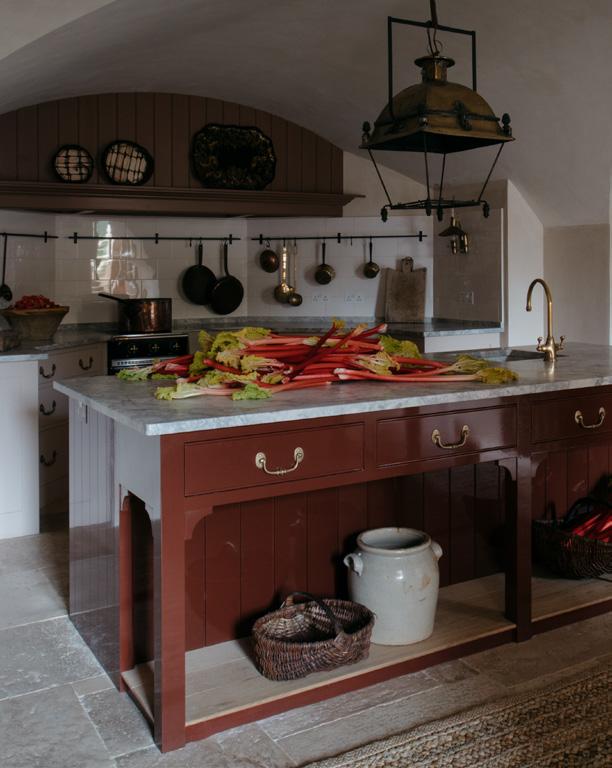 Original flagstones are a visual connection between a series of vaulted spaces. A prep area for produce from the kitchen garden joins a corridor with tall larder cupboards where vegetables and jars of preserves are stored.