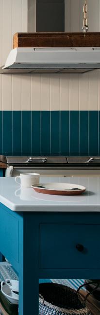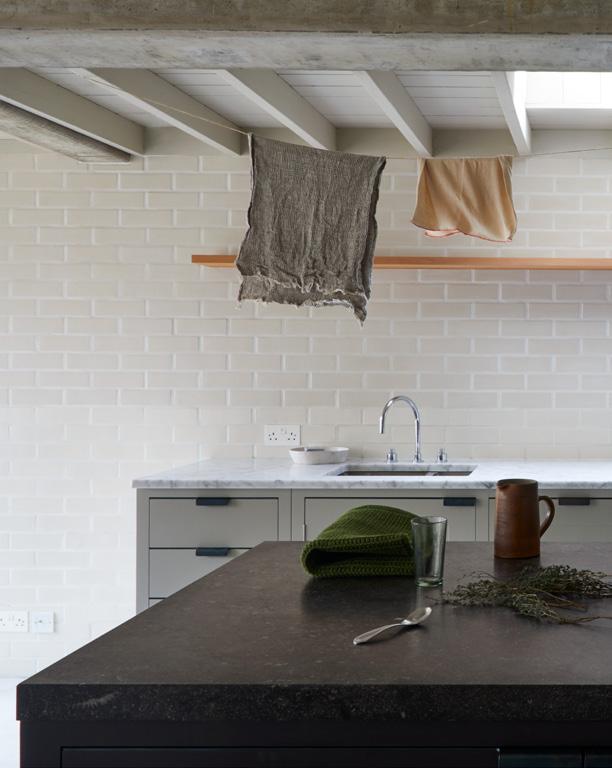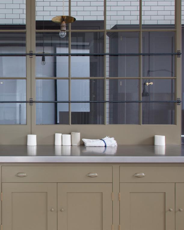 The cupboards were designed to allow access to the historic window casements and have painted back panels that look good when viewed from outside. The panelled walls are free of cupboards to preserve a sense of openness in the narrow space. A colour drench of army camp on both walls and joinery helps to unify the elements, broken only by the warmth of a simple copper backsplash.