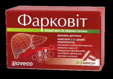 31 ПОКАЗАННЯ: � ураження печінки як наслідок токсичних отруєнь, інфекційного гепатиту, ураження паразитами, хронічного алкоголізму � розлади печінки внаслідок порушення метаболічних процесів: цукрового діабету, гіпотиреозу, тиреотоксикозу ЯК ЗАСТОСОВУВАТИ ФАРКОВІТ? Застосовувати дорослим по 1 капсулі 3 рази на добу після прийому їди. Тривалість застосування: 1-3 місяці або за призначенням лікаря. ФОРМА ВИПУСКУ 90 капсул: 15 капсул у блістері, 6 блістерів у картонній коробці ВИРОБНИК