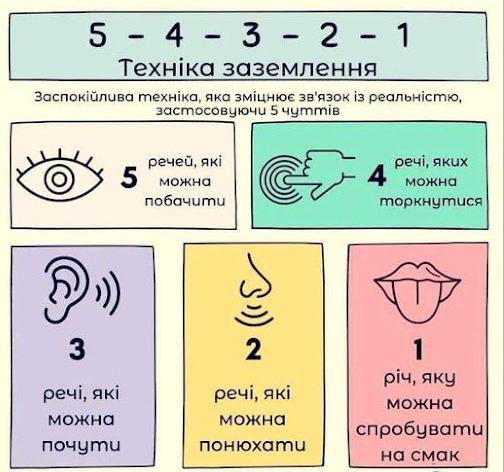 ● Зняти напруження та полегшити тривожний стан нам допомагають техніки заземлення (інструмент саморегуляції). Техніка заземлення дозволяє тілу заспокоїтися і подати сигнал про відсутність реальної загрози.
